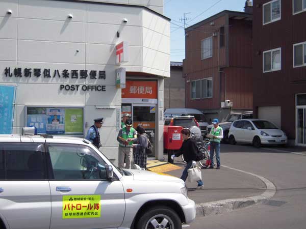 原則週1回の割合で、新琴似西全域において青色回転灯を装着した自家用車4台で、巡回パトロールを行っている。 1回のパトロールに約2時間をかけて、空き巣、車上狙い、不審者などの警戒に当たっている。 また、年金支給月には、多発している振り込め詐欺被害からお年寄りを未然に守るため、 金融機関前においてチラシを配布するなどの街頭啓発も行っている | |